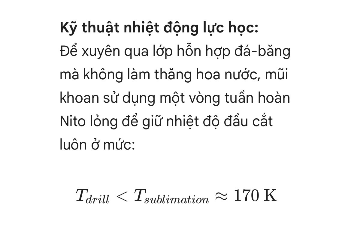 Nhưng báu vật của nó chính là Mũi Khoan Nhiệt Sâu (Cryogenic Thermal Drill – CTD) nằm ở trục trung tâm. Đây là thiết bị duy nhất vào thời điểm này có khả năng khoan xuyên qua lớp đá bazan cứng nhất mà vẫn giữ được mẫu vật băng ở trạng thái nguyên vẹn.